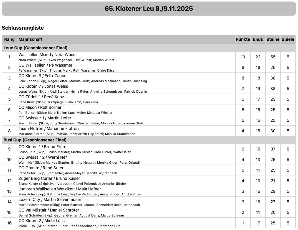 Der Klotener Leu ist 65 und hat das Pensionsalter erreicht, aber von Ruhestand kein Fahrzeugsortiersystem – ähh keine Spur. 16 gut gelaunte Teams hatten am Wochenende vom 8./9. November 2025 wieder den Weg in die Curlinghalle Wallisellen gefunden, um sich den vielen Fragen auf und neben dem Eis zu stellen.